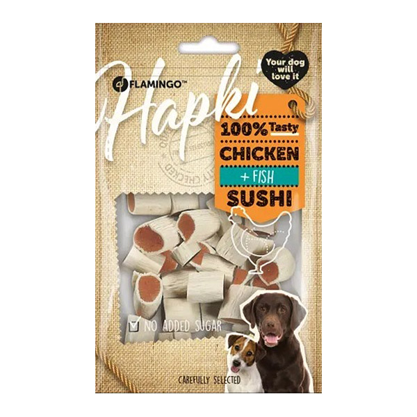 تشویقی سگ با طعم سوشی ماهی و مرغ برای سنین بالای سه ماه مناسب بوده و محصولی از برند بلژیکی فلامینگو است. این محصول سازگاری خوبی با دستگاه گوارش دارد.