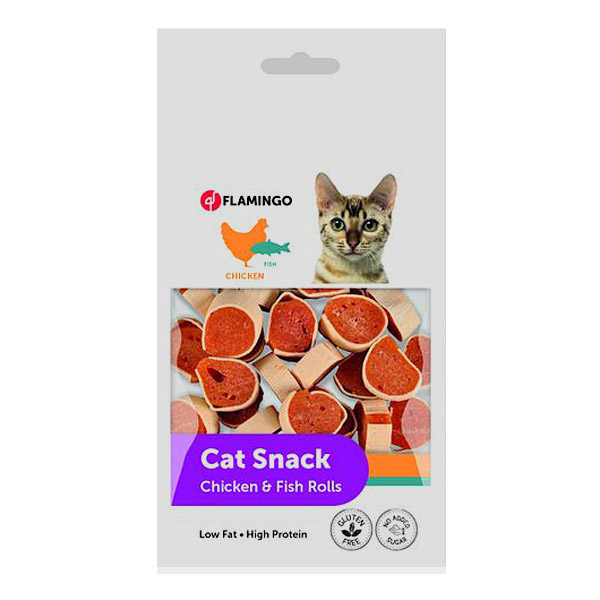 اسنک رولی برند فلامینگو با طعم مرغ و ماهی تولید شده و یک تشویقی جذاب برای گربه های بالغ به شمار می آید. این محصول فاقد گلوتن و قند افزودنی است.