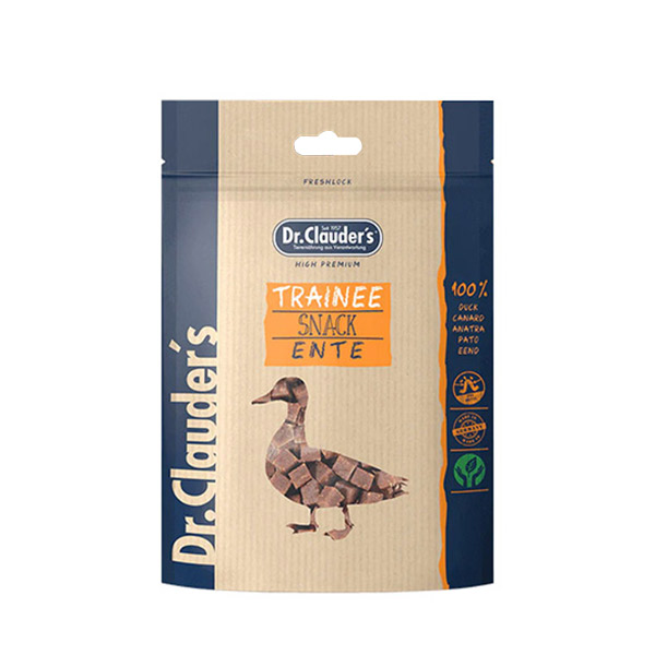 تشویقی دکتر کلادرز با طعم اردک Trainee Snack Duck میان وعده ای لذیذ و نرم برای همه سنین سگ و گربه می باشد که به صورت اسنک های مکعبی تهیه شده است.