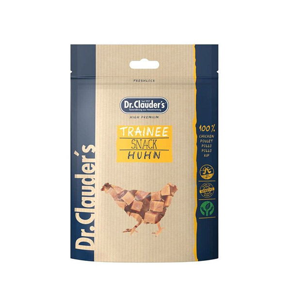 تشویقی سگ و گربه دکتر کلادرز Trainee Snack Huhn با طعم مرغ حاوی ترکیبات پری بیوتیک بوده و برای همه سنین و نژادها مناسب است.
