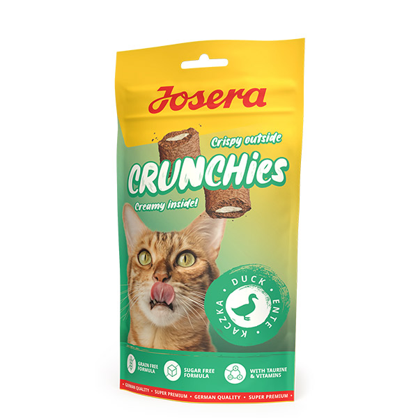 جوسرا تشویقی با طعم اردک Crunchies Duck را به صورت کرانچی مغزدار تهیه کرده است که همه نژادهای گربه می توانند آن را مورد استفاده قرار دهند.