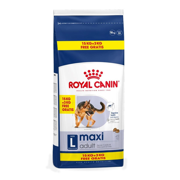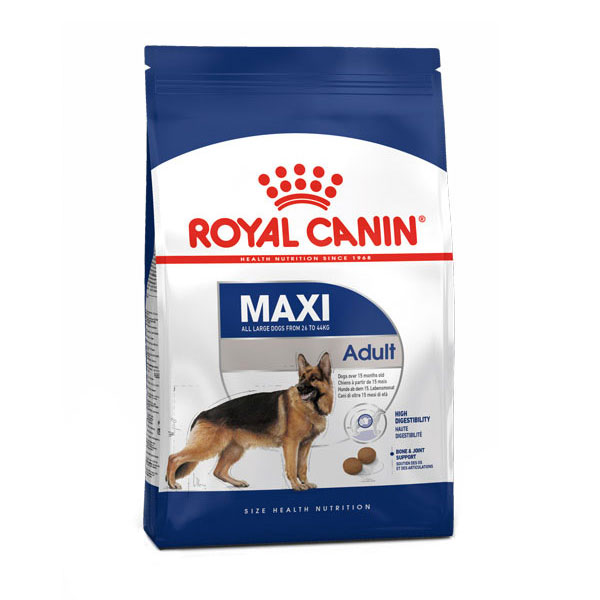 مکسی ادالت Maxi Adult رویال کنین در بسته های با وزن 18 کیلوگرم غذای ویژه سگ های بالغ نژاد بزرگ است که برای تقویت استخوان ها و مفاصل مفید می باشد.