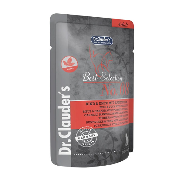 پوچ دکتر کلادرز با طعم بیف و اردک Beef & Duck برای گربه های بالغ همه نژادها تولید شده و حاوی سیب زمینی، فیبر و ویتامین ها می باشد.