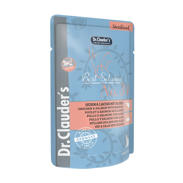 پوچ گربه عقیم شده دکتر کلادرز Sterilised یک وعده کامل و مغذی با طعم مرغ و سالمون و جلبک اسپیرولینا می باشد که برای همه نژادها تولید شده است.