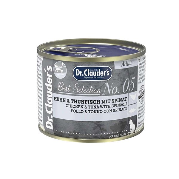 کنسرو دکتر کلادرز با طعم مرغ و ماهی تن Chicken & Tuna یک وعده کامل غذایی برای گربه های بالغ است که در ترکیبش از بذر کتان و اسفناج استفاده شده است.