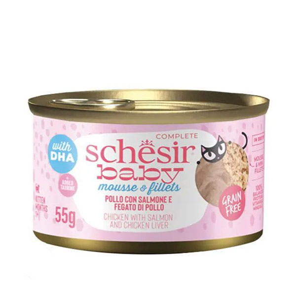 کنسرو کیتن شسیر به عنوان یک وعده غذایی کامل به صورت میکس مرغ و سالمون و جگر Baby Kitten Mix برای بچه گربه های 1 تا 12 ماهه تولید شده است.