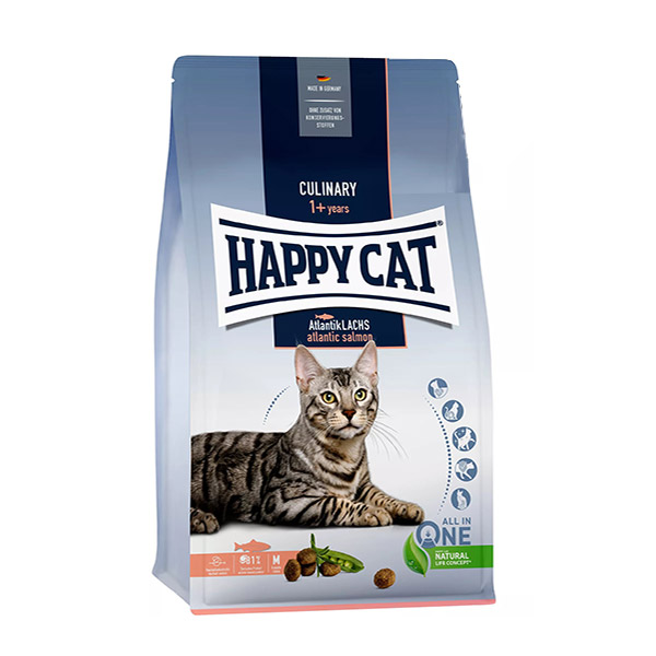 غذای کالینری هپی کت با طعم سالمون برای گربه های بالغ تولید شده است. این محصول به تقویت و افزایش زیبایی پوست و مو کمک می کند.
