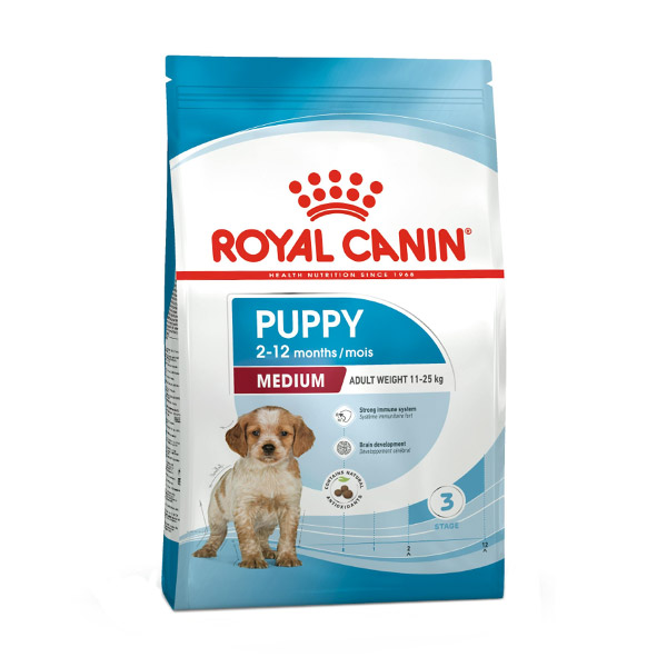غذای مدیوم پاپی از برند رویال کنین برای توله سگ های نژاد متوسط زیر 1 سال مناسب بوده که با وزن 15 کیلوگرم نیز عرضه می شود. این محصول حاوی انواع ویتامین است.
